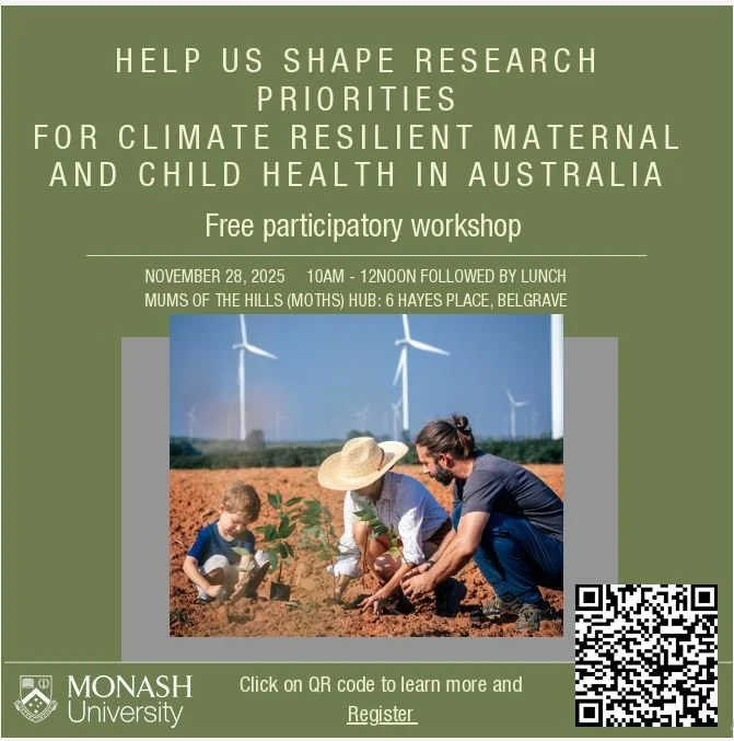 You’re invited to join this research project by Monash University to understand how climate change (heatwaves, fires, floods, storms) is affecting the health, safety and care of pregnant women, new mums and young children in Australia and what needs to happen next.
